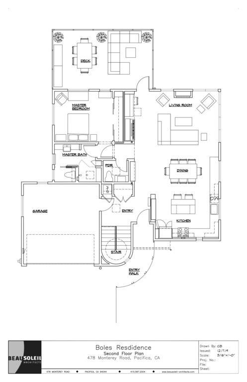 As husband and wife architects, it was our dream to build our own home. We were lucky to find this vacant lot in Pacifica, a small quiet beach community just south of San Francisco. The main level with one bedroom, one and a half baths, the kitchen and living areas and a large deck with outdoor barbecue is handicapped accessible right from the driveway. Downstairs you’ll find two more bedrooms, two baths, a laundry room and a lovely garden with a shaded deck. The house is all electric, solar powered.