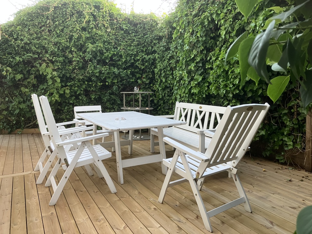 The garden is mostly south-facing and we have a play area and lots of flowers. We have patios in three directions so it is possible to enjoy both sun and shade.
