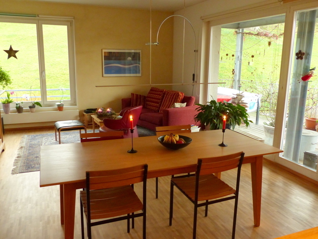 Wir leben in einer hellen und gemütlichen Vierzimmerwohnung. Neben einem Wohnbereich mit offener Küche gibt es drei Schlafzimmer. Unser «fünftes» Zimmer ist der riesige Balkon, wo wir im Sommer gerne essen, oder auch mal ein gutes Buch oder ein Glas Wein geniessen.