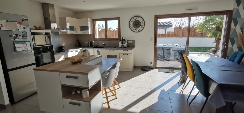Terrain de 716 m2 avec un potager et une balançoire. Maison de décembre 2013 très lumineuse avec 135m2 habitable. Nous avons 3 chambres d'environ 10m2 avec placard (possibilité d'ajouter matelas supplémentaire ou lit parapluie) une salle de bain avec douche à l'italienne, baignoire et vasque. Une lingerie avec tout le nécessaire. Une cuisine ouverte sur le séjour d'environ 55 m2 et un coin salon de 25m2. Un garage de 30 m2 est aussi à disposition (possibilité de rentrer une voiture).